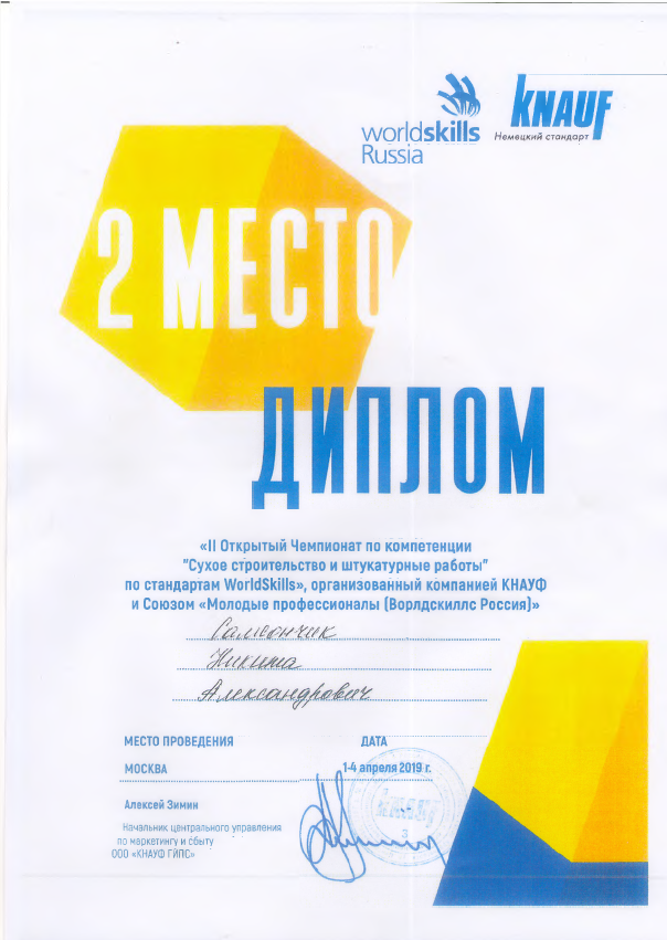 Поздравляем Самсончика Никиту Александровича, учащегося группы 111-17 филиала «Индустриально-педагогический колледж» учреждения образования «Республиканский институт профессионального образования», занявшего 2 место во втором открытом чемпионате по компетенции «Сухое строительство и штукатурные работы» по стандартам WorldSkills.