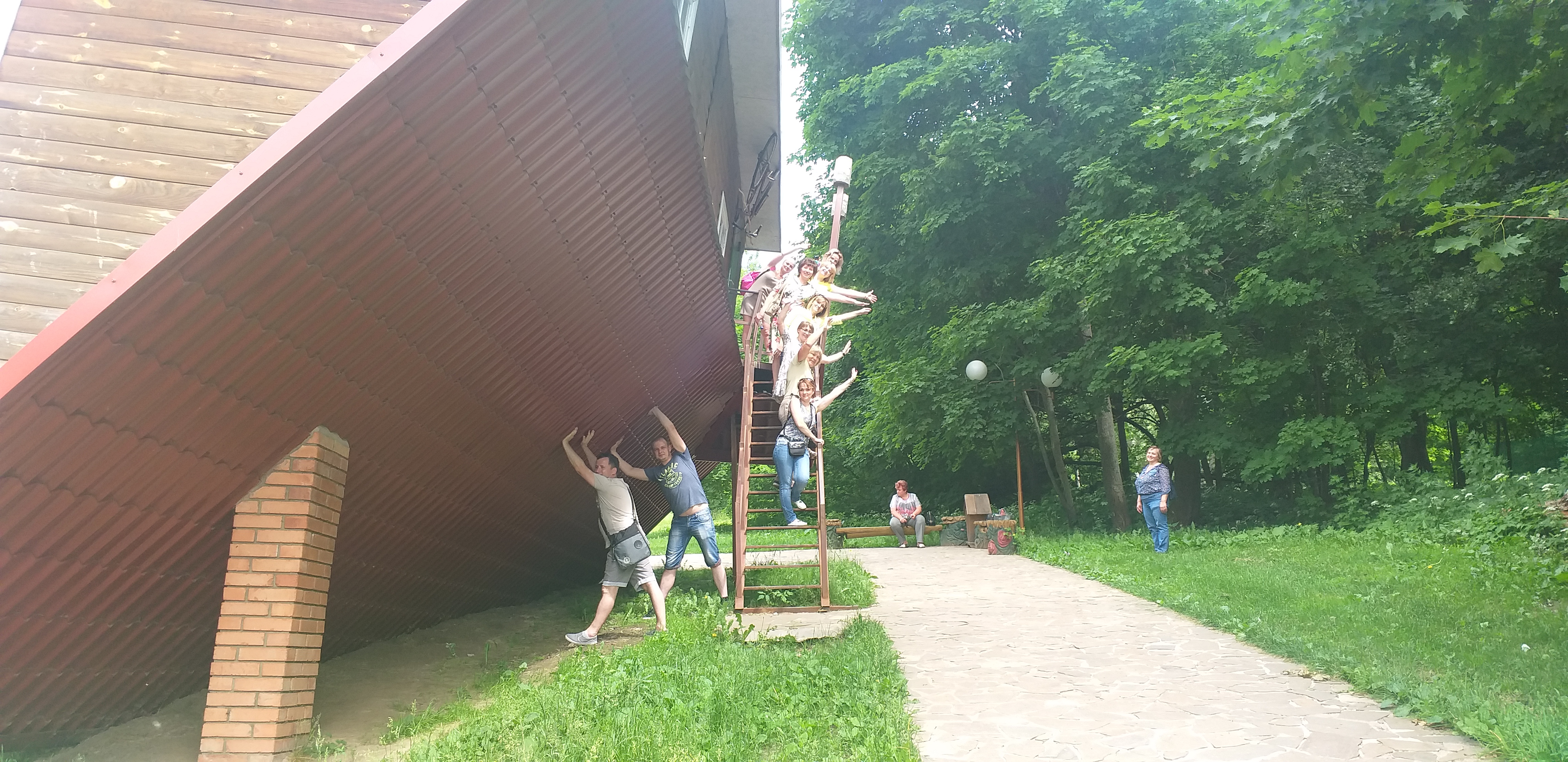 Мы прошли по улице мастеров, где понаблюдали за их работой и приобрели на память их изделия. Посетили в усадьбе и свой небольшой зоосад - домашние птицы, козочки и страусы. Загадали желание возле 400-летнего дуба желаний. И, наконец, посетили отличное место, где проверили свой вестибулярный аппарат - изюминку комплекса - дом-перевёртыш.