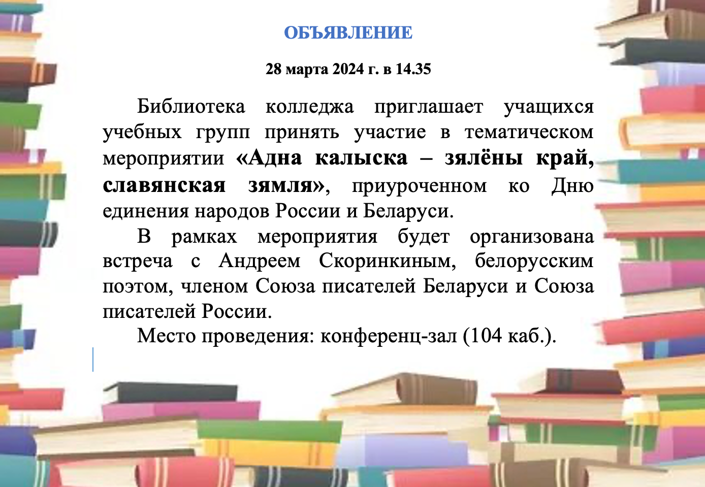 28 марта 2024 г. в 14.35 Библиотека колледжа приглашает учащихся учебных групп принять участие в тематическом мероприятии «Адна калыска – зялёны край, славянская зямля», приуроченном ко Дню единения народов России и Беларуси.