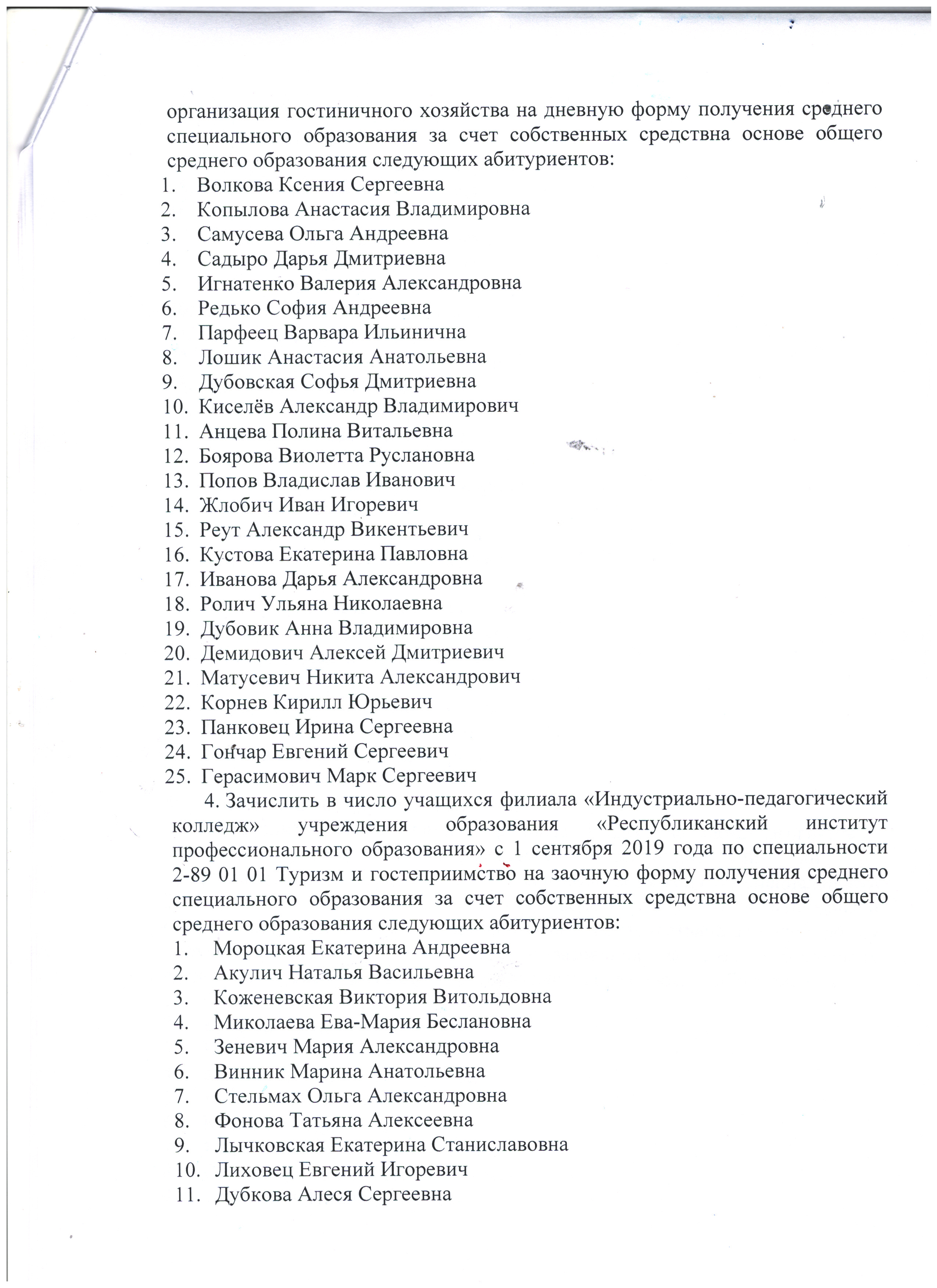 Приказ о зачислении абитуриентов поступивших за счёт собственных средств на дневную и заочную форму получения образования