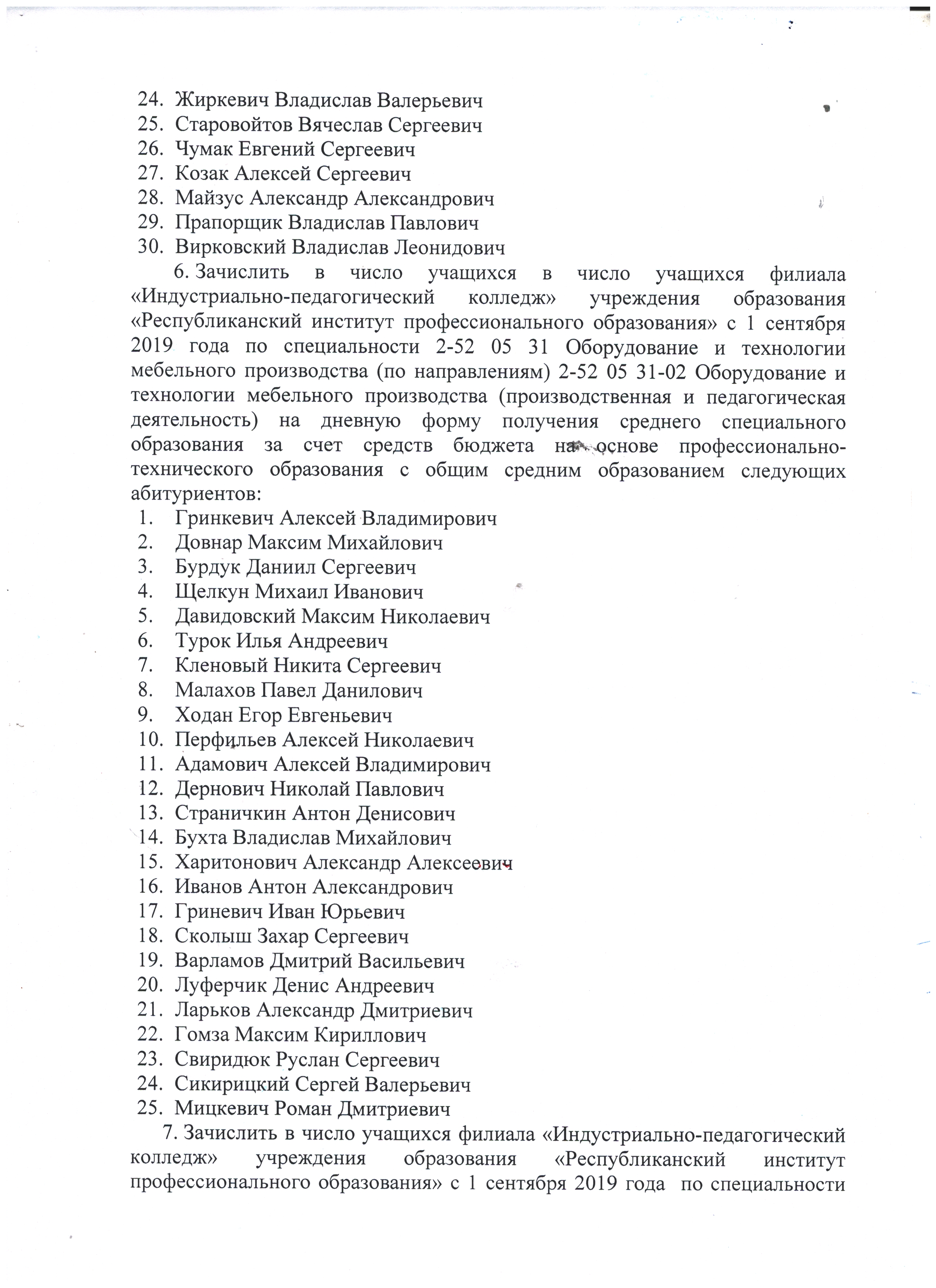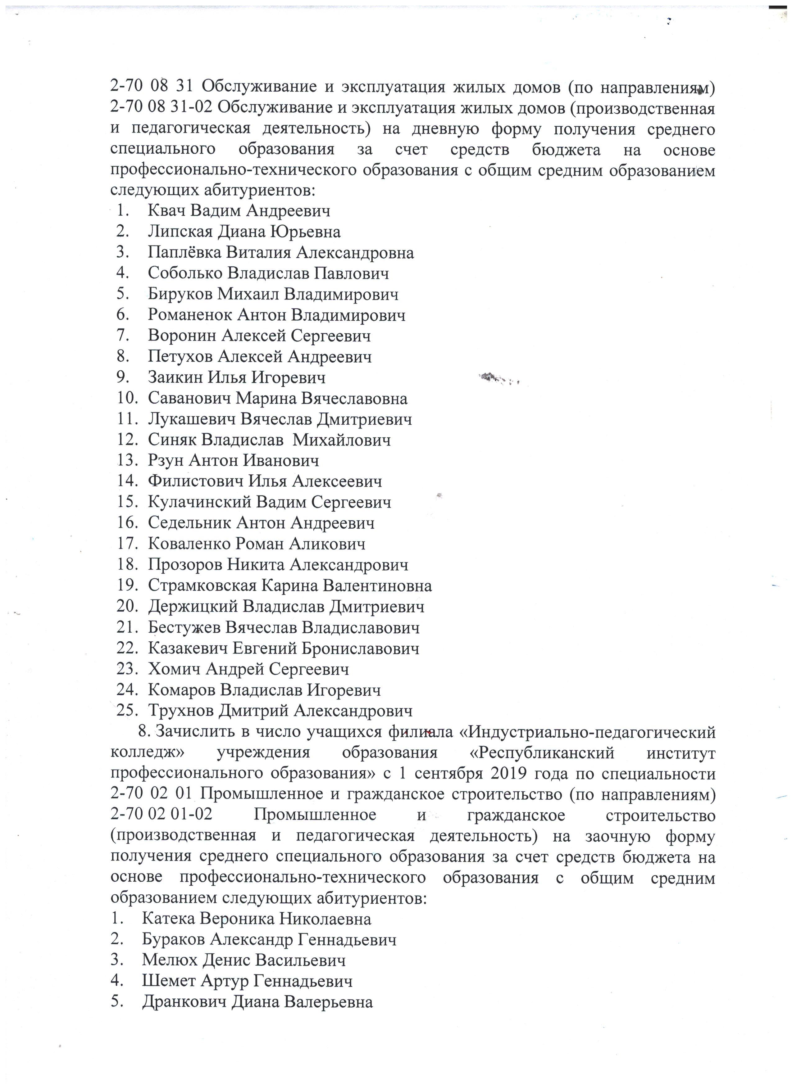 Приказ о зачислении абитуриентов поступивших за счёт средств бюджета на дневную и заочную форму получения образования
