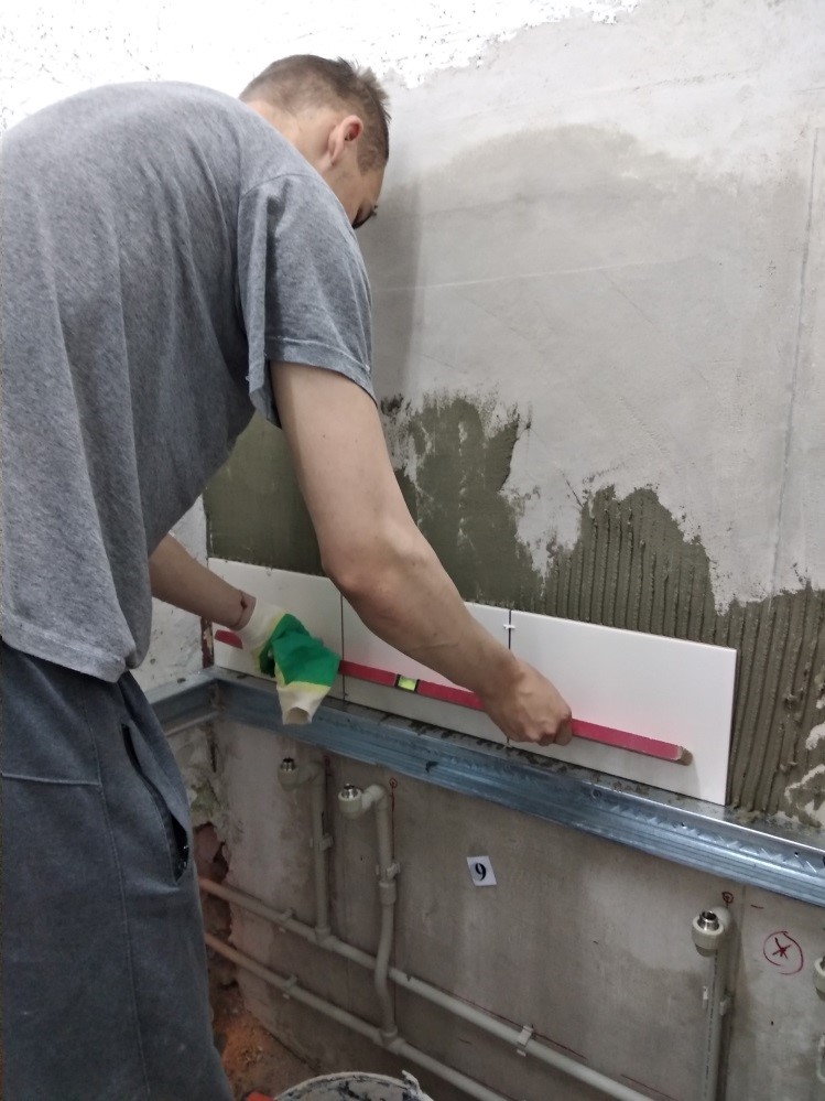 Практический этап квалификационного экзамена на получение квалификации рабочего «Штукатур 4-го разряда» и «Облицовщик-плиточник 3-го разряда» проводился в учебной группе 113-18 на участке производства ремонтных работ в общежитии колледжа в отдельных жилых блоках.