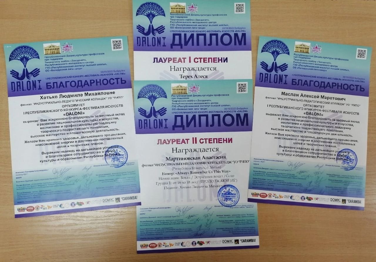 Россыпь наград республиканского конкурса-фестиваля искусств "DALONI" завоевали учащиеся филиала ИПК УО РИПО. И вернулись далеко не с пустыми руками.
