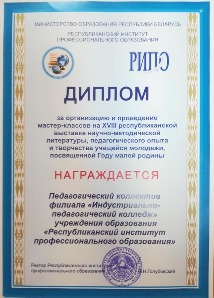 Поздравляем педагогический коллектив филиала «Индустриально-педагогического колледжа» УО РИПО, который принял участие 17–19 апреля 2019 года в XVIII республиканской выставке научно-методической литературы, педагогического опыта и творчества учащейся молодежи, посвященной Году малой родины с наградами!!!