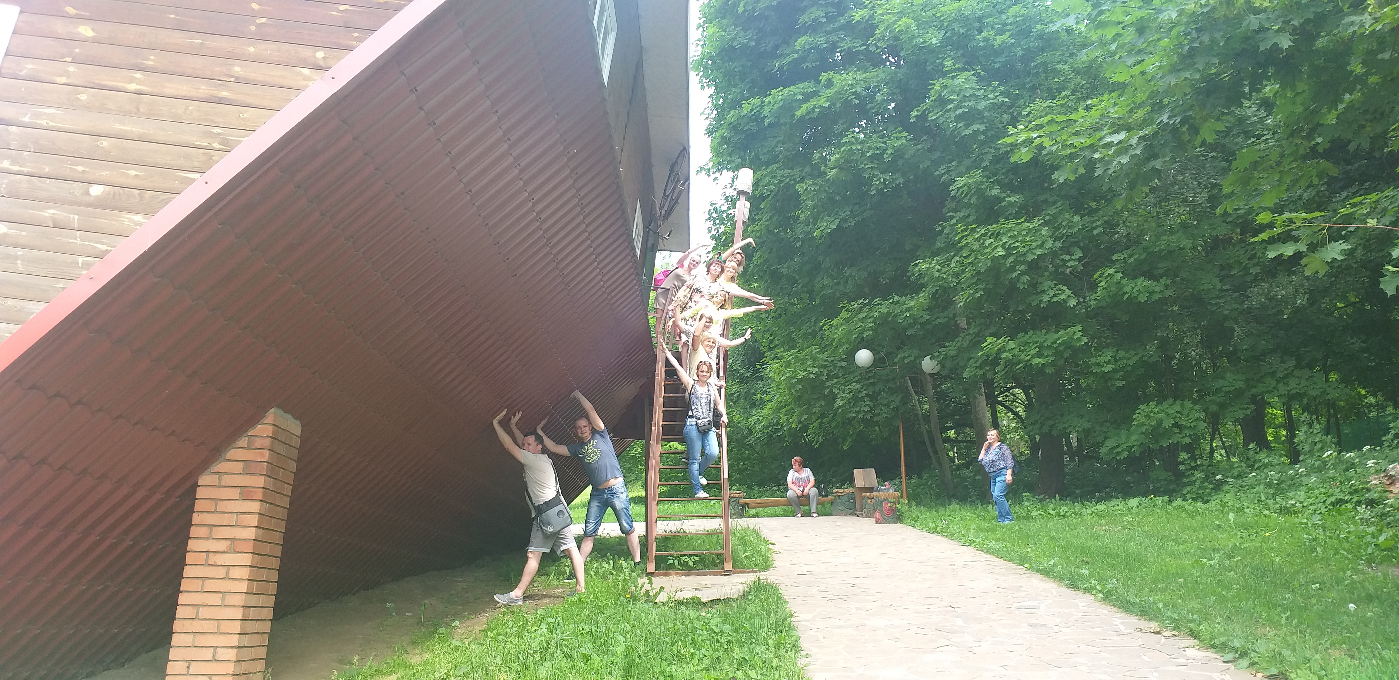 Мы прошли по улице мастеров, где понаблюдали за их работой и приобрели на память их изделия. Посетили в усадьбе и свой небольшой зоосад - домашние птицы, козочки и страусы. Загадали желание возле 400-летнего дуба желаний. И, наконец, посетили отличное место, где проверили свой вестибулярный аппарат - изюминку комплекса - дом-перевёртыш.