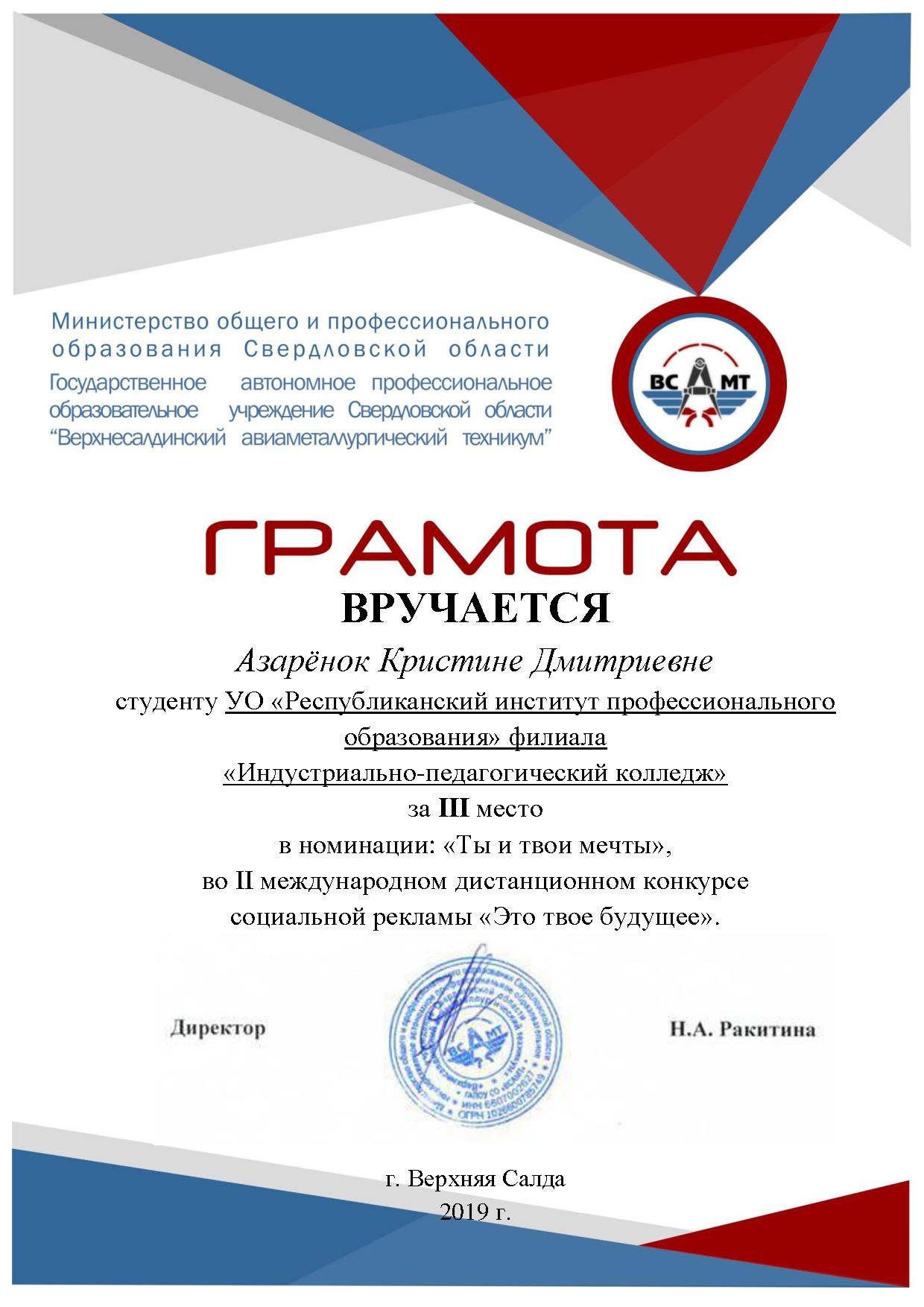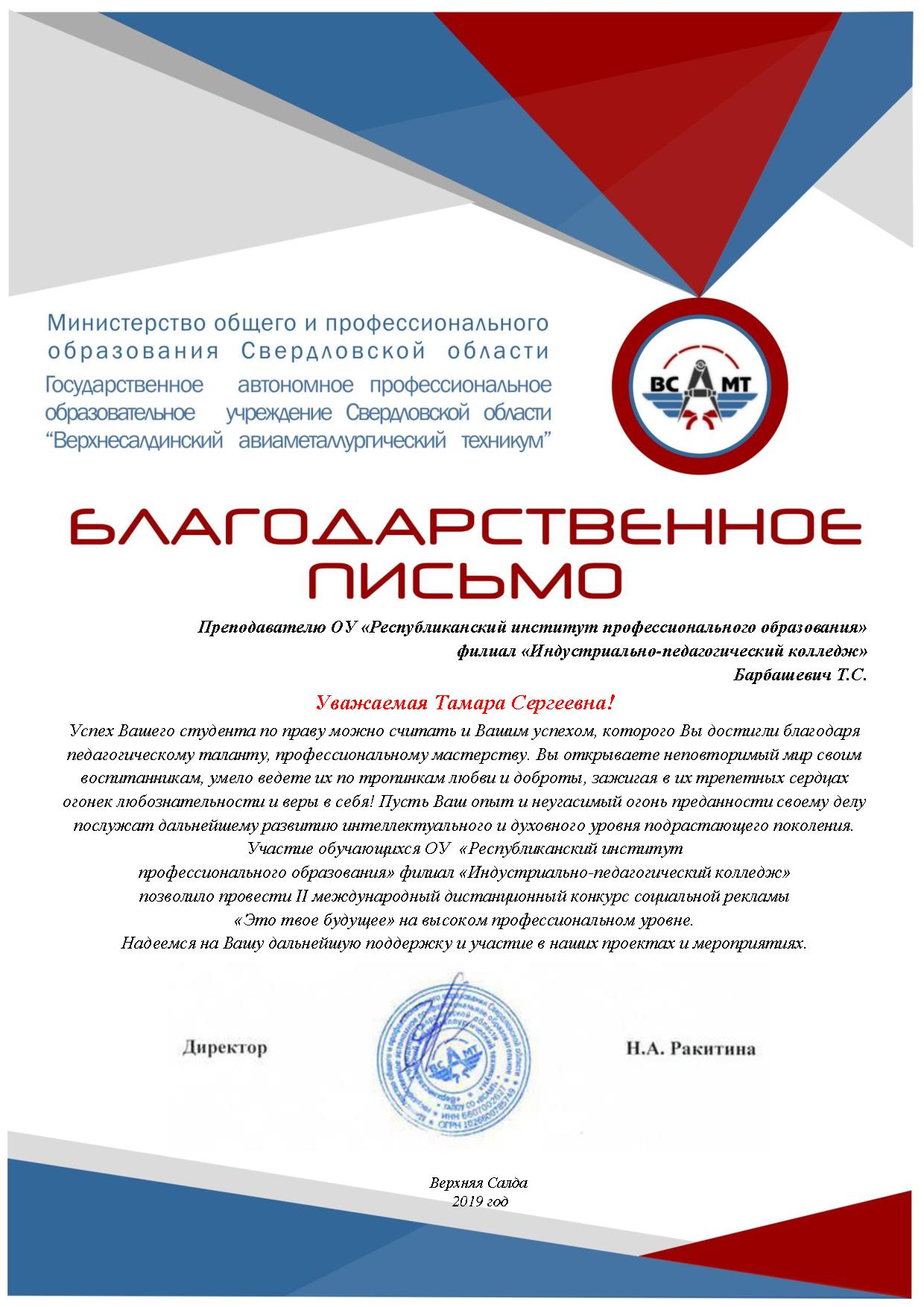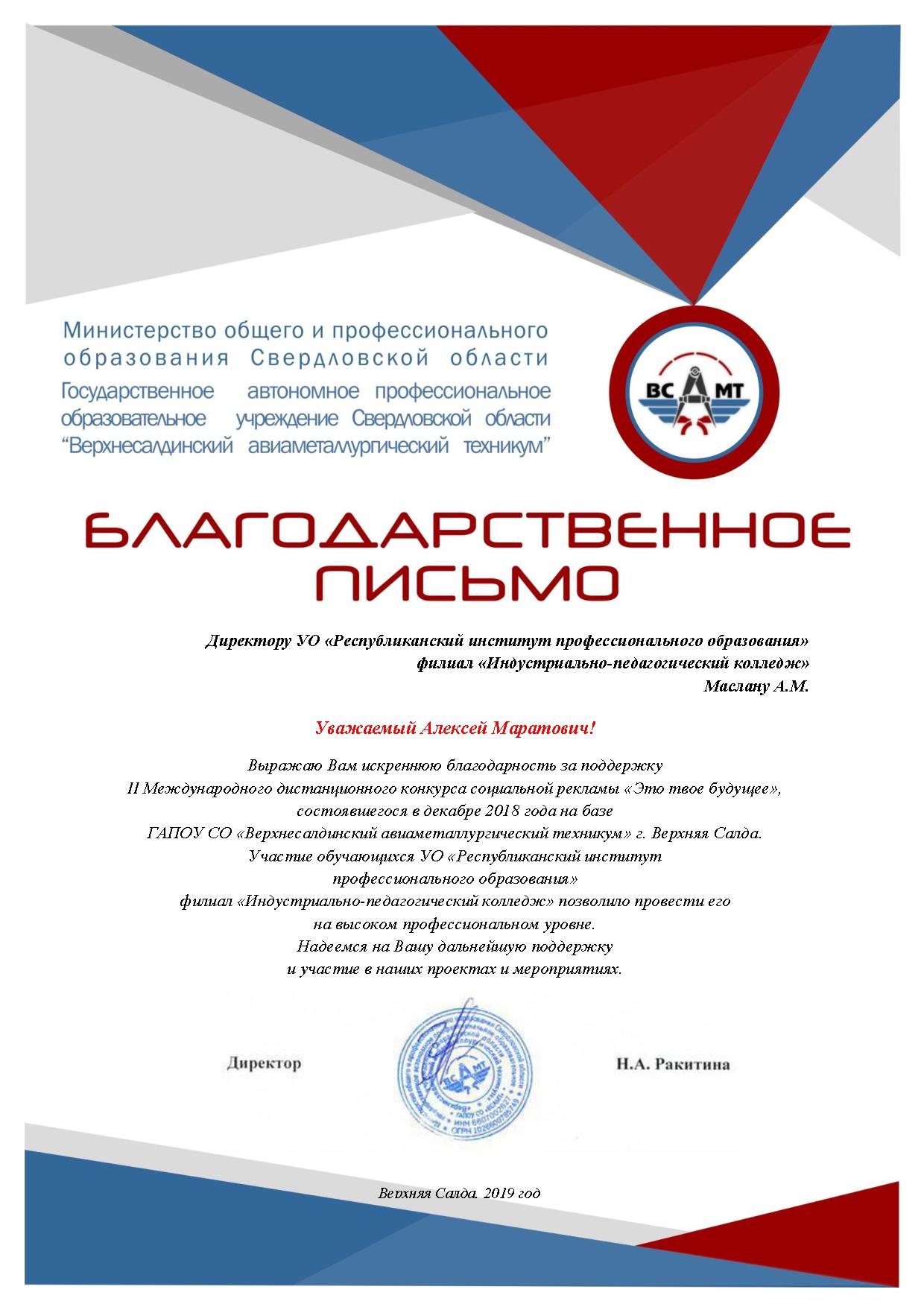 В декабре 2018 года филиал ИПК УО РИПО принял участие во II международном дистанционном конкурсе социальной рекламы «Это твое будущее» организатором, которого выступило Государственное автономное профессиональное образовательное учреждение Свердловской области «Верхнесалдинский авиаметаллургический техникум».