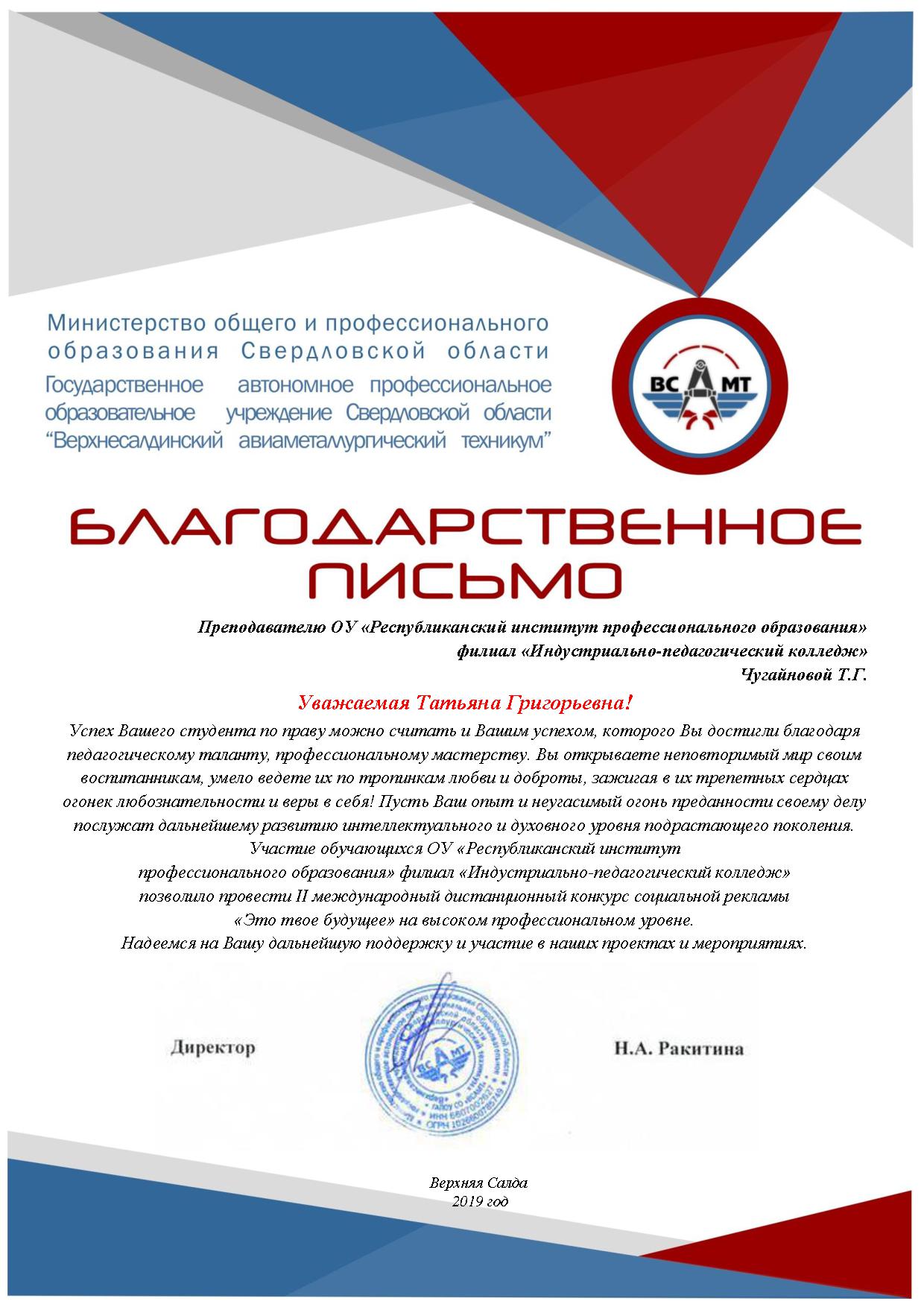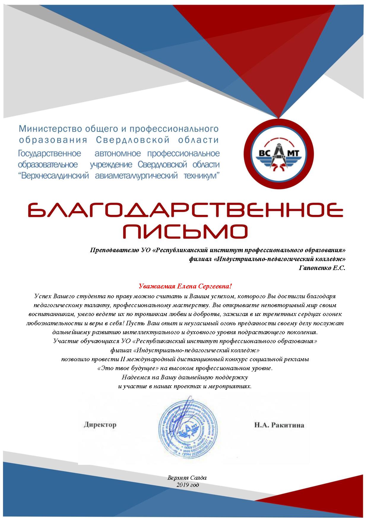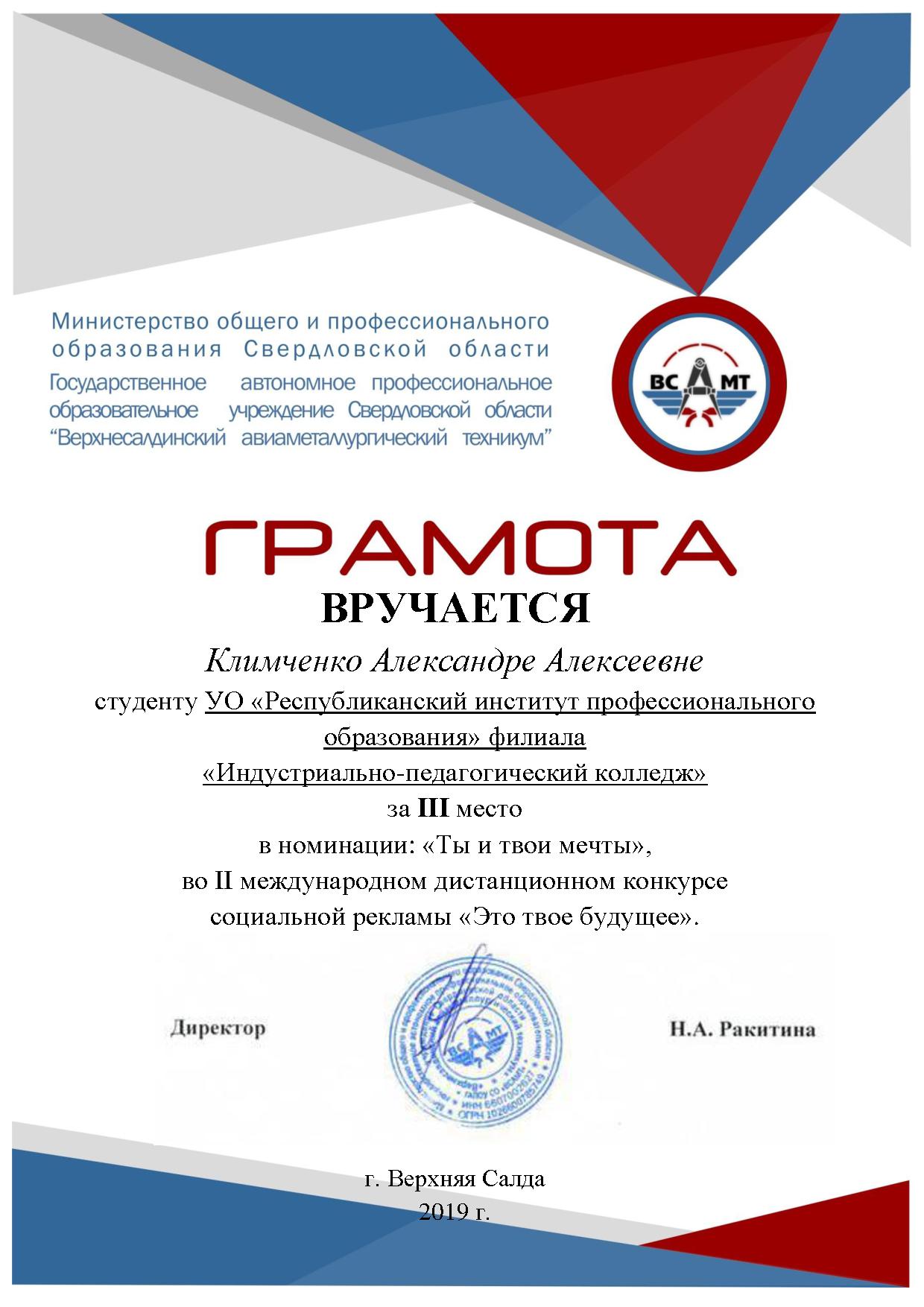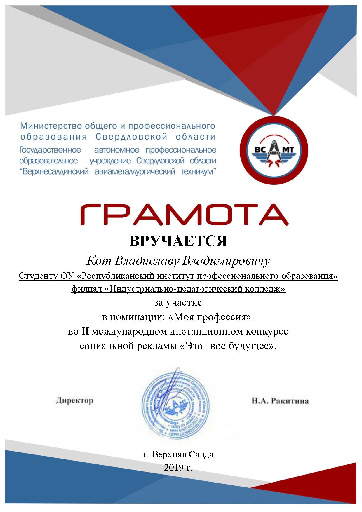 В декабре 2018 года филиал ИПК УО РИПО принял участие во II международном дистанционном конкурсе социальной рекламы «Это твое будущее» организатором, которого выступило Государственное автономное профессиональное образовательное учреждение Свердловской области «Верхнесалдинский авиаметаллургический техникум».