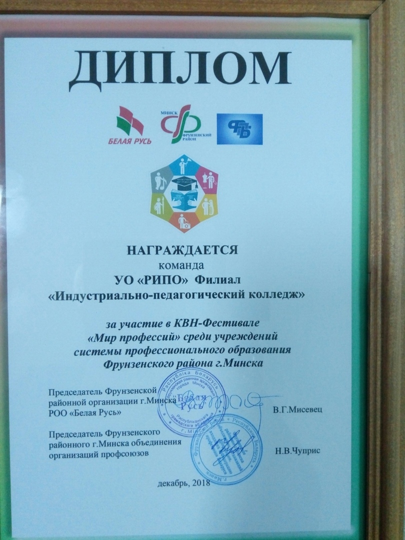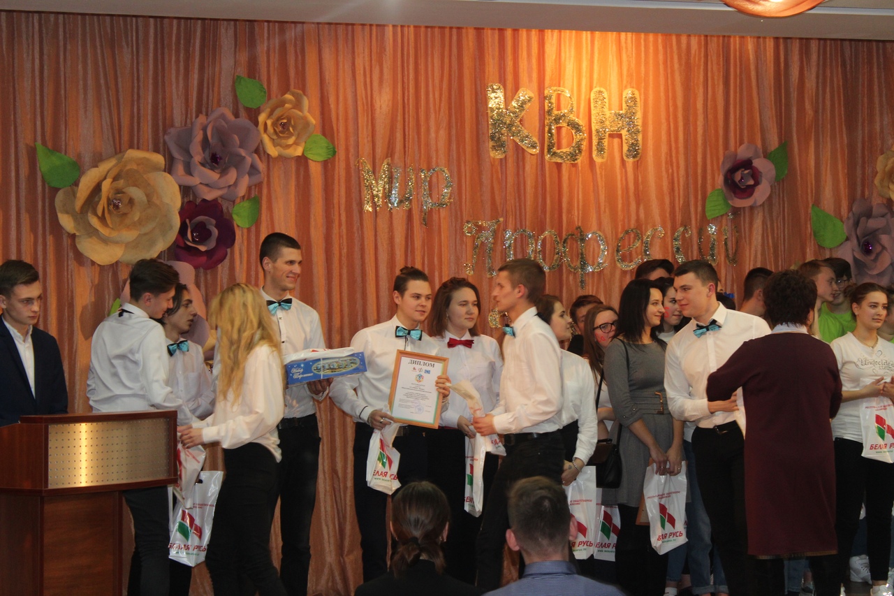 18 декабря 2018г. на базе филиала МГЛУ "Лингво-гуманитарный колледж" состоялся КВН-Фестиваль "Мир профессий". В Фестивале приняли участие 5 команд учебных заведений системы профессионального образования расположенных на территории Фрунзенского района г.Минска. Программа состояла из четырех конкурсов: "Профессиональный портрет" - визитка команды, "Мой труд-крут" - творческое домашнее задание, "В мире профессий" - разминка, "ПрофИмпровизация".