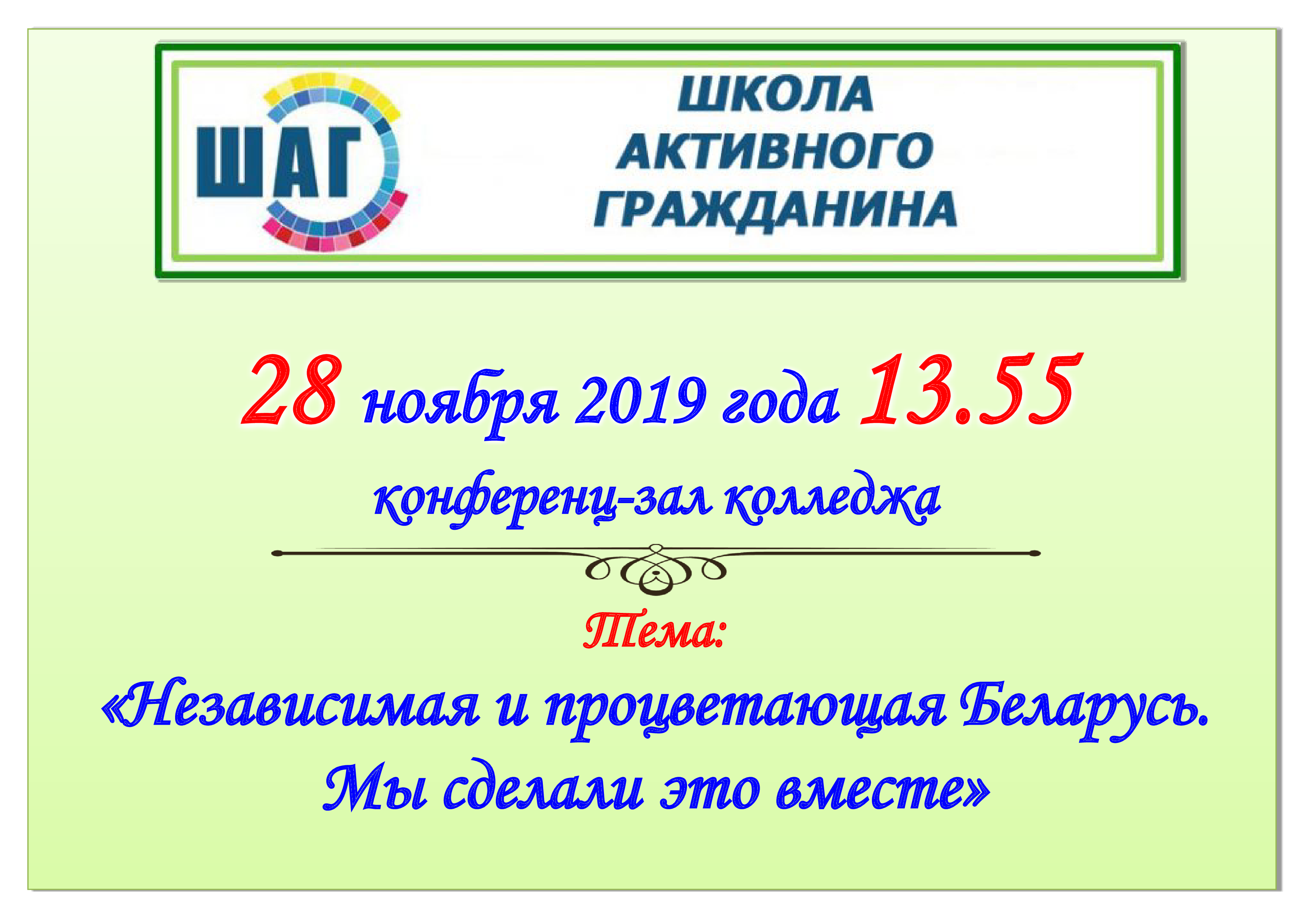 28 ноября в рамках работы информационно - образовательного проекта "Школа Активного Гражданина" была рассмотрена тема "Независимая и процветающая Беларусь. Мы сделали это вместе".