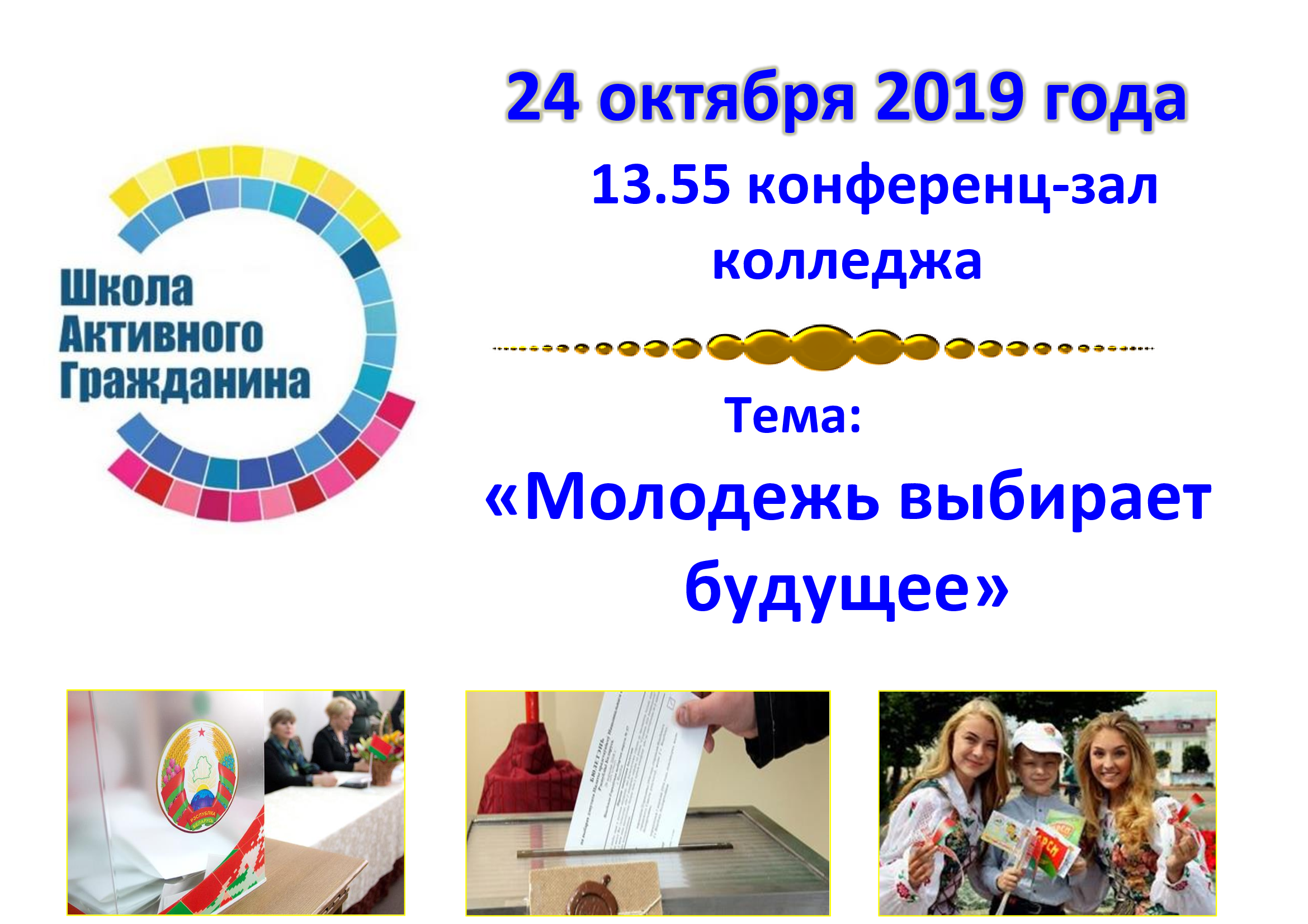 Единый день информирования под общим девизом «ШАГ» — «Школа активного гражданина» на тему: "Молодежь выбирает будущее" состоялся 24.10.2019 в конференц-зале колледжа. Были рассмотрены четыре информационных блока...