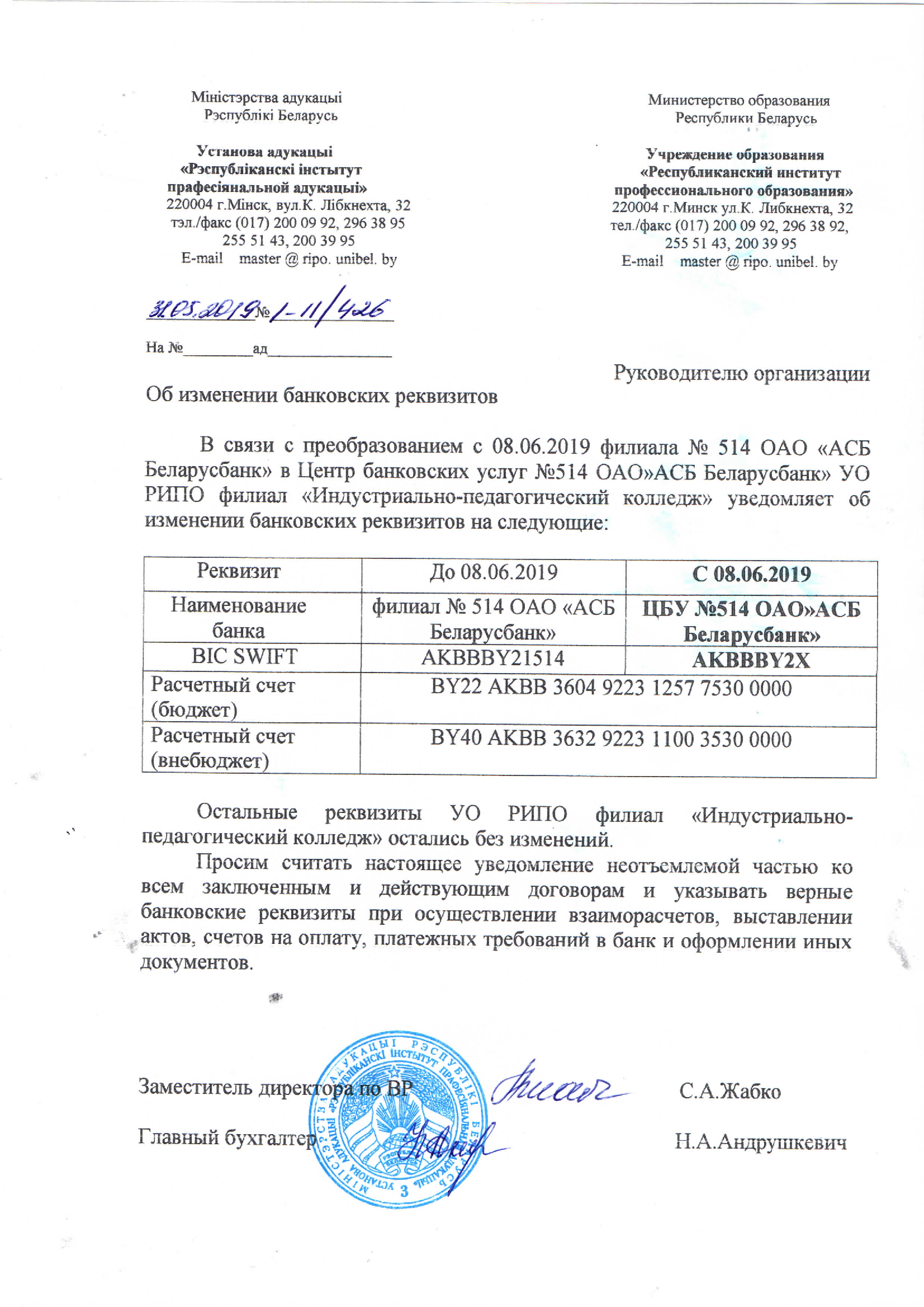 УО РИПО филиал «Индустриально-педагогический колледж» уведомляет об изменении банковских реквизитов на следующие...