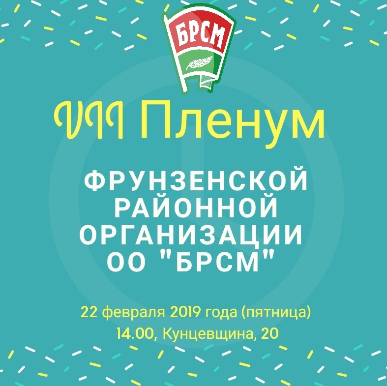 22 февраля 2019 года состоится VII Пленум Фрунзенской районной организации Общественного объединения «Белорусский республиканский союз молодежи», на котором будут подведены итоги деятельности Союза молодёжи за 2018 год и определены перспективы развития на 2019 год.