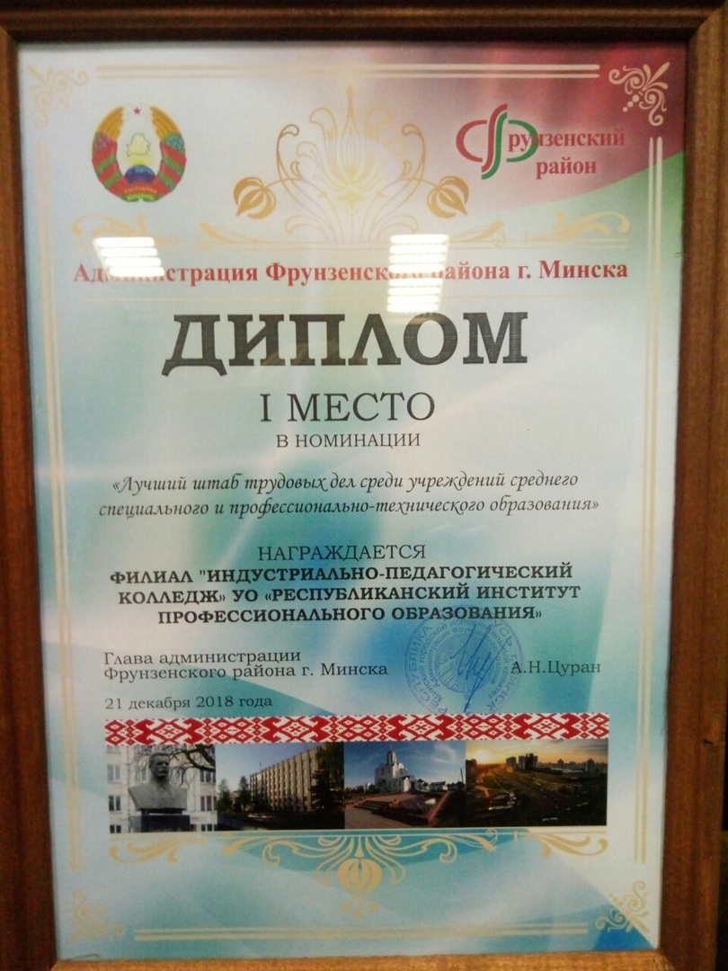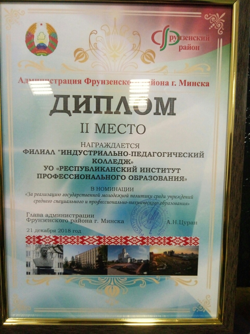 ДИПЛОМОМ II степени и кубком в номинации "За реализацию государственной молодежной политики среди учреждений образования среднего специального и профессионально-технического образования ";