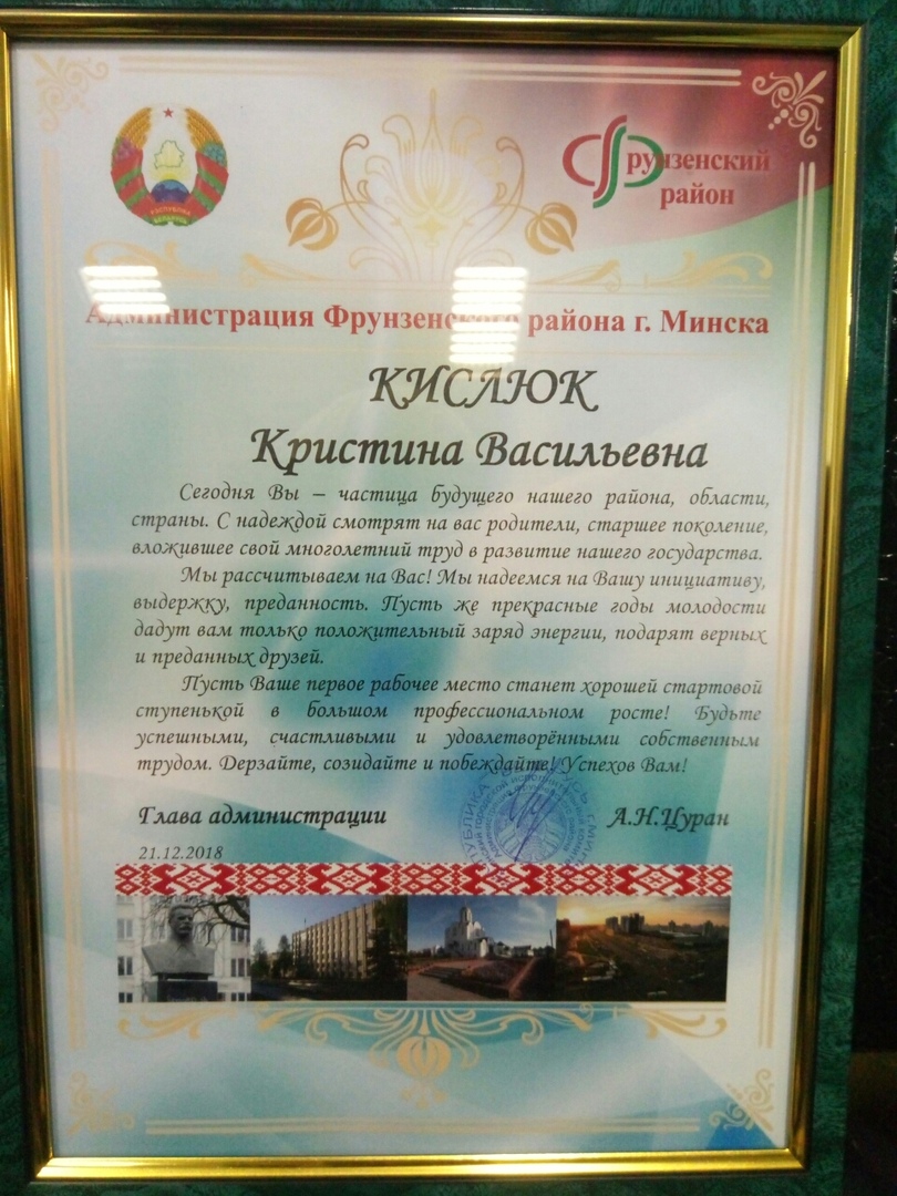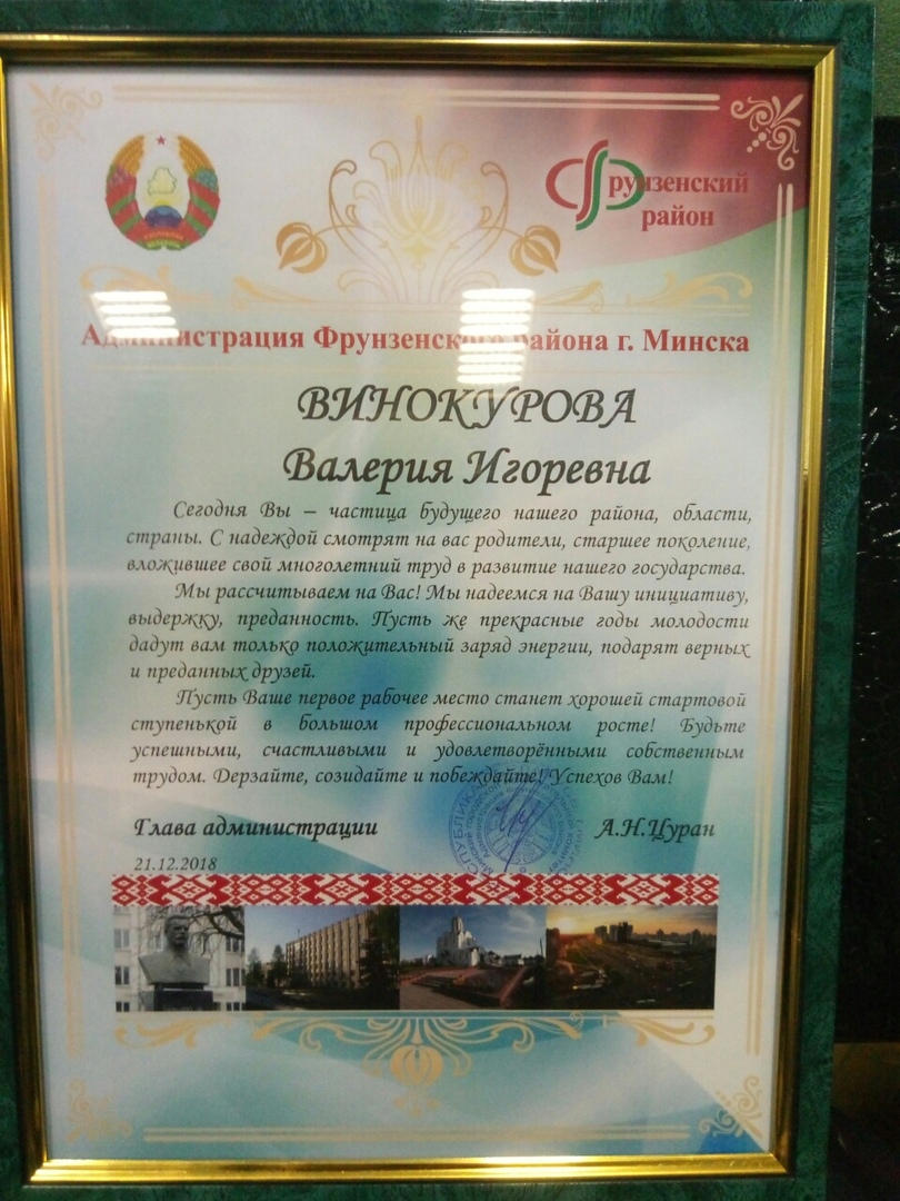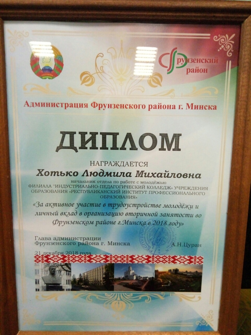 ДИПЛОМОМ за активное участие в трудоустройстве молодежи и личный вклад в организацию вторичной занятости во Фрунзенском районе г. Минска в 2018 году награжден начальник отдела по работе с молодежью Хотько Людмила Михайловна;