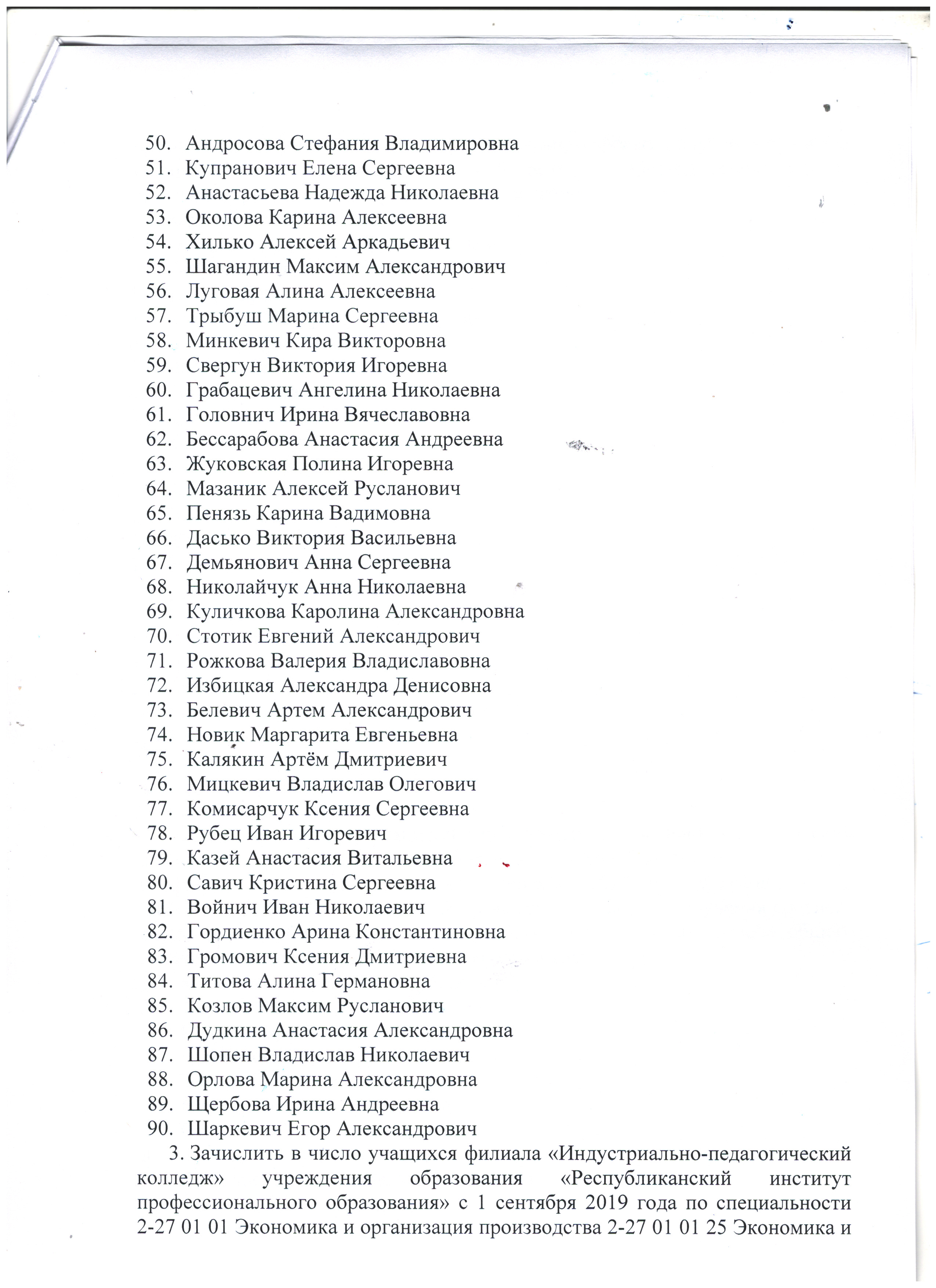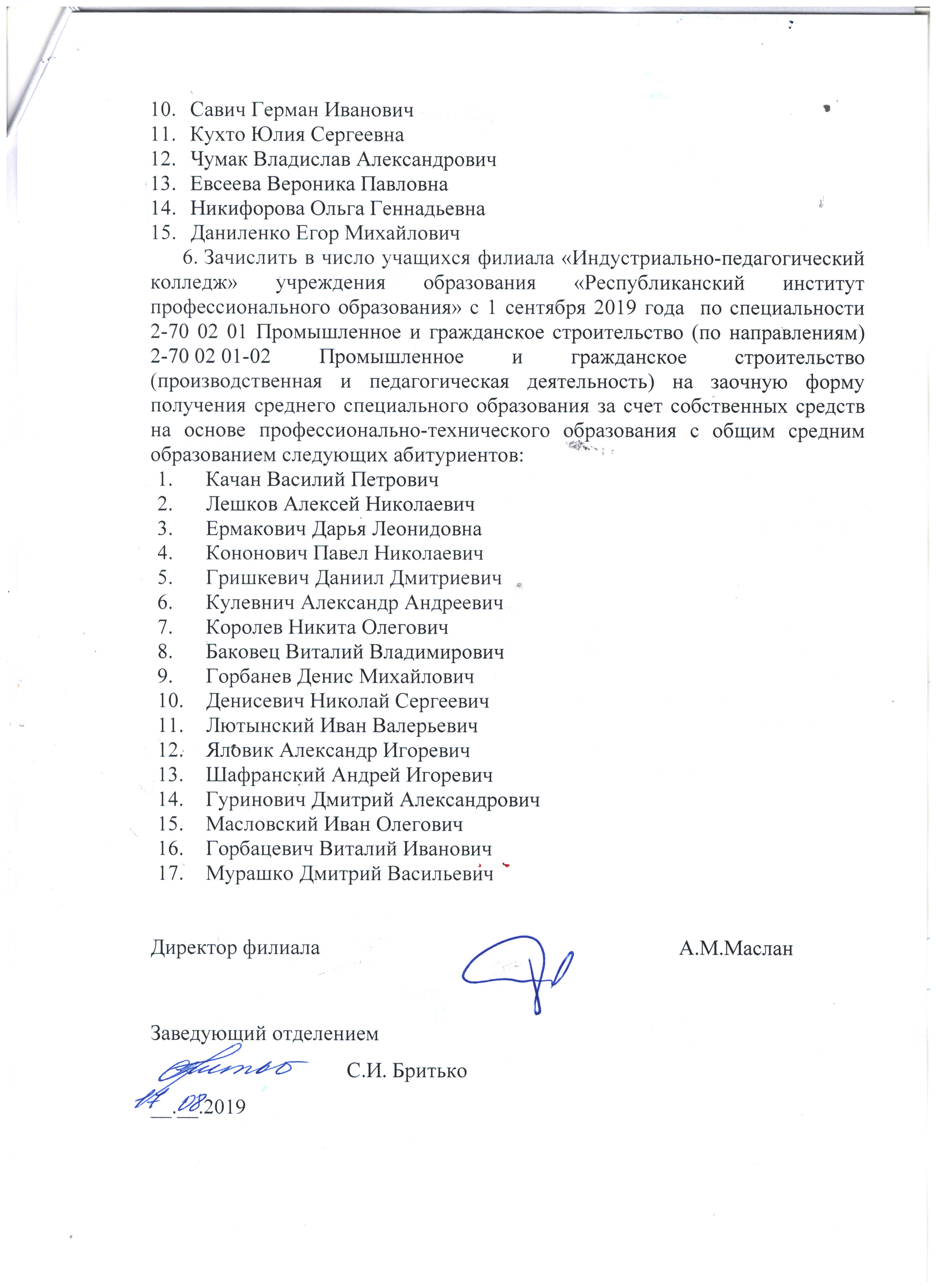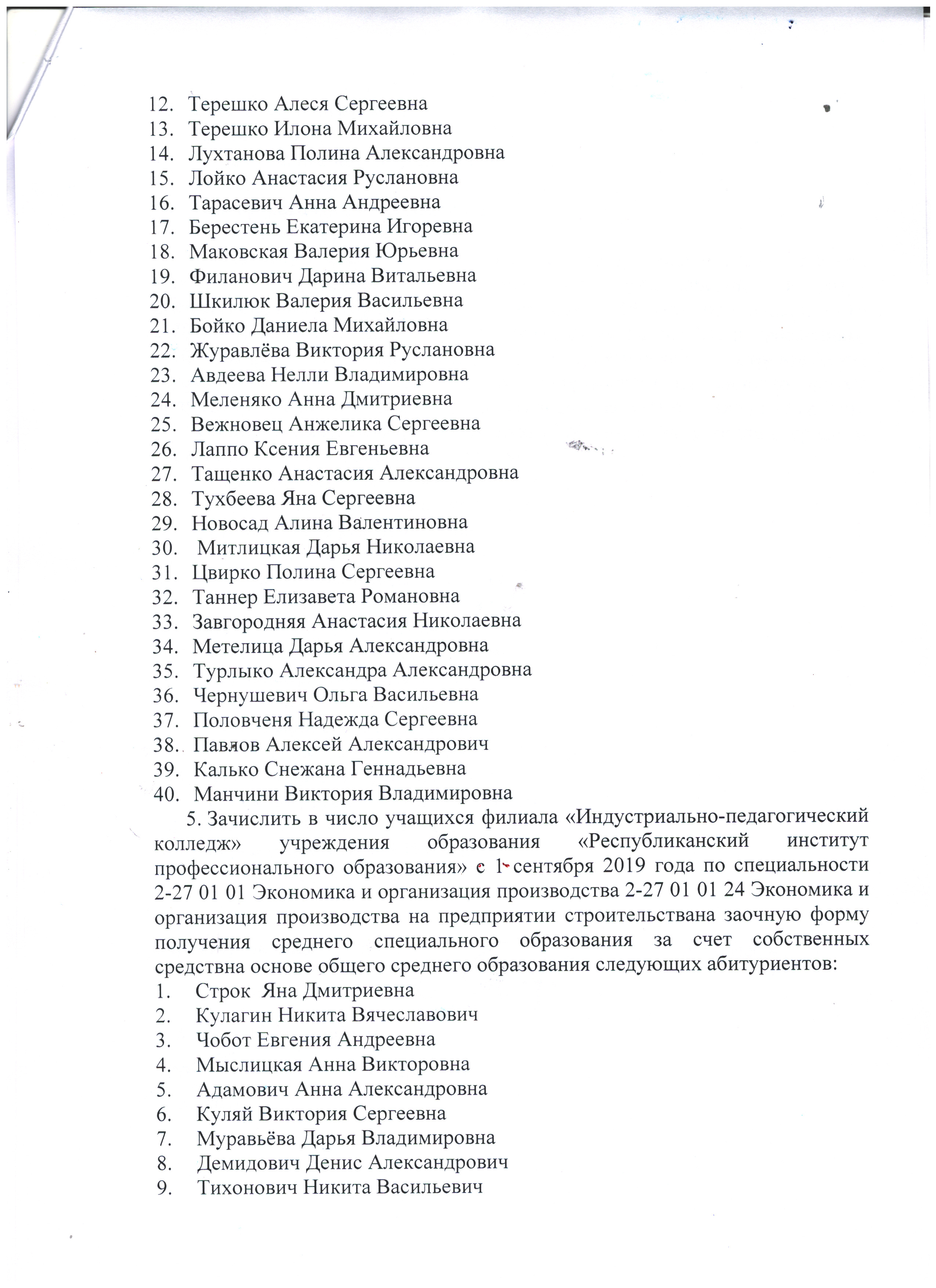 Приказ о зачислении абитуриентов поступивших за счёт собственных средств на дневную и заочную форму получения образования