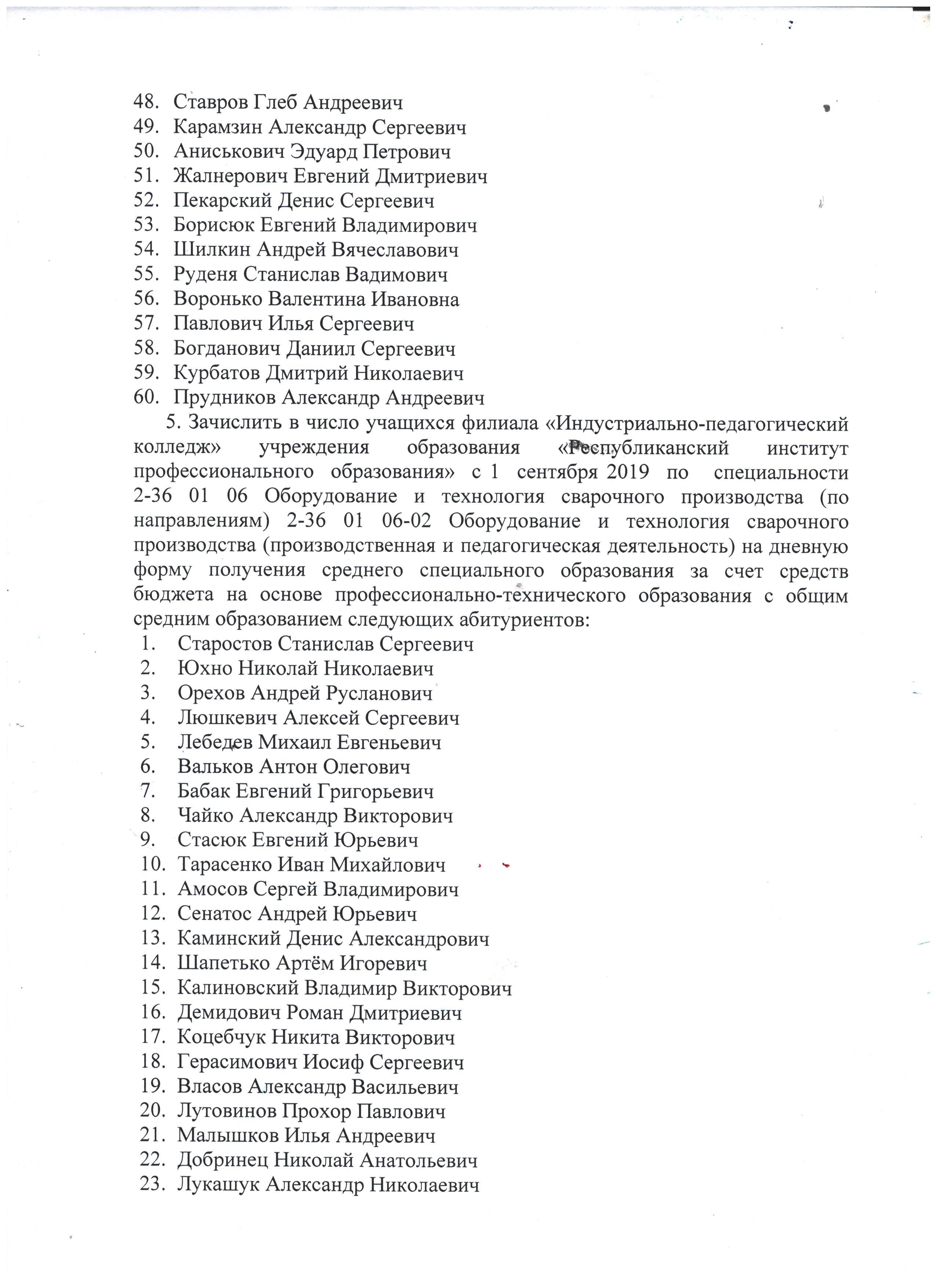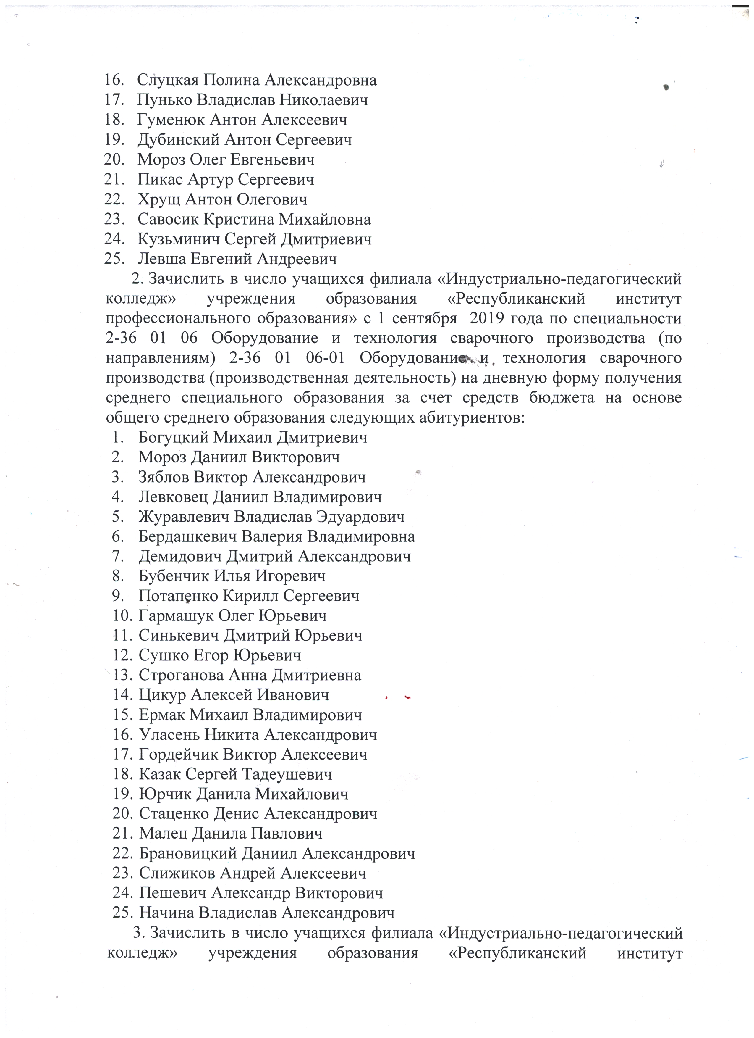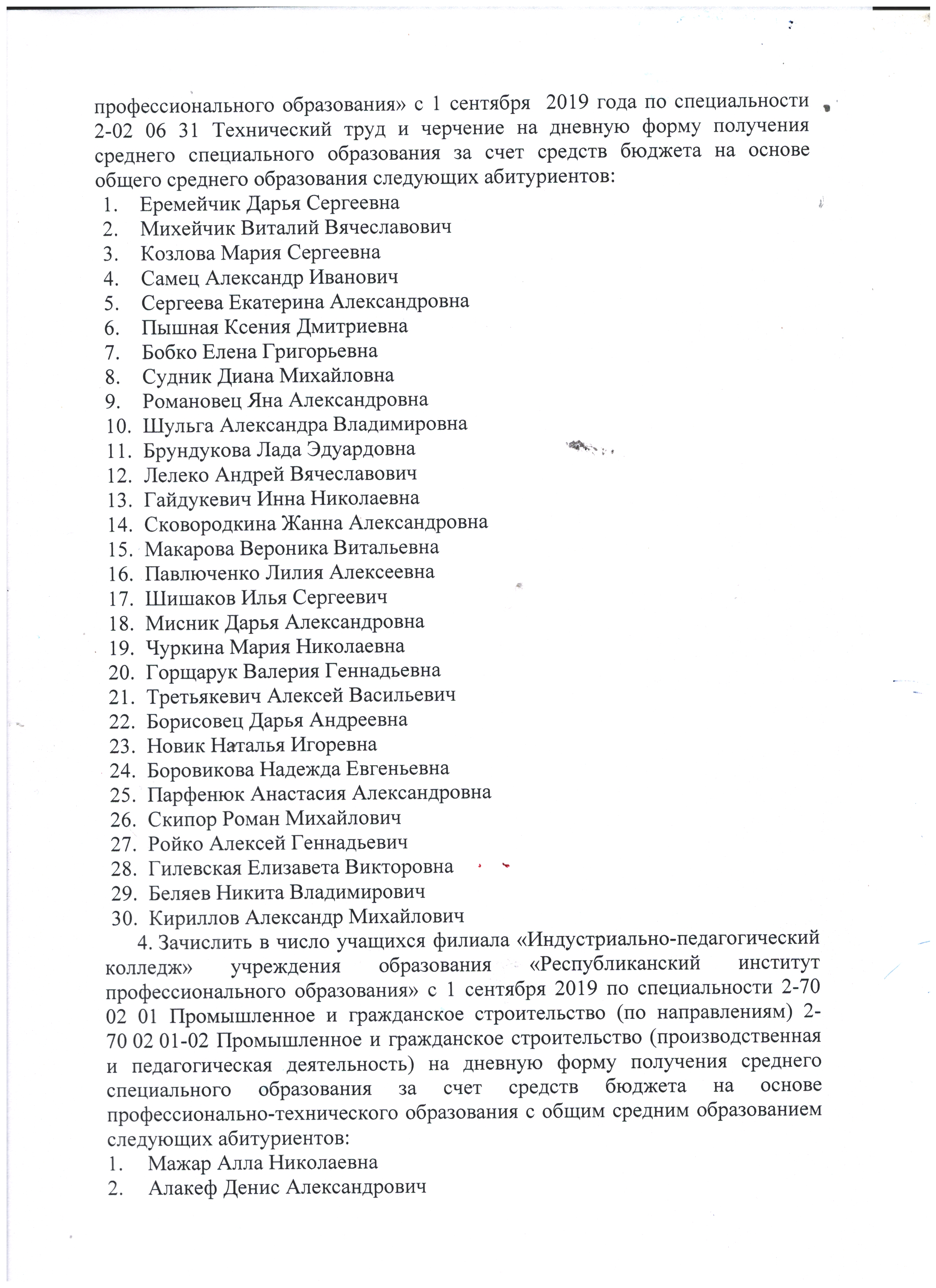 Приказ о зачислении абитуриентов поступивших за счёт средств бюджета на дневную и заочную форму получения образования