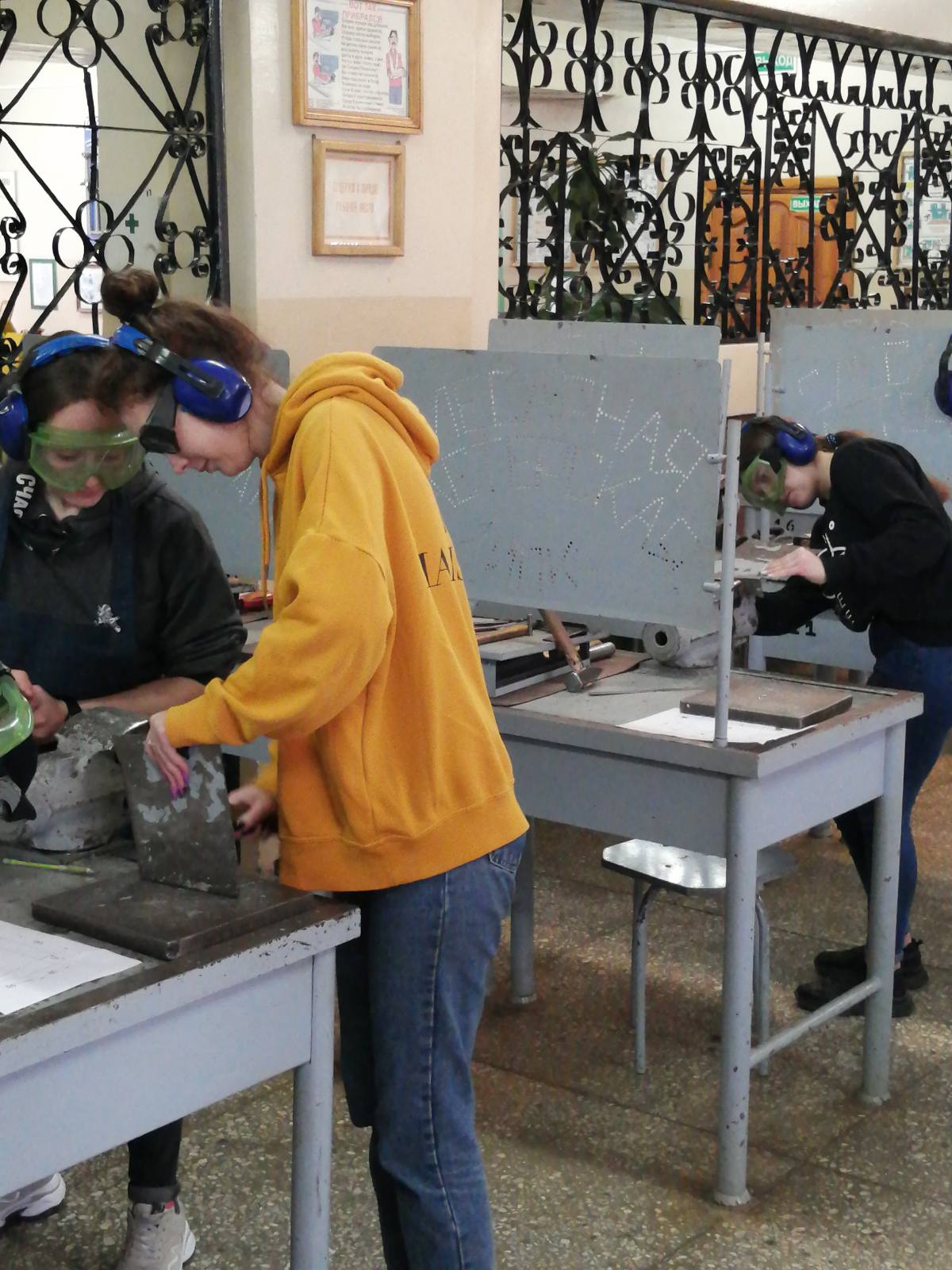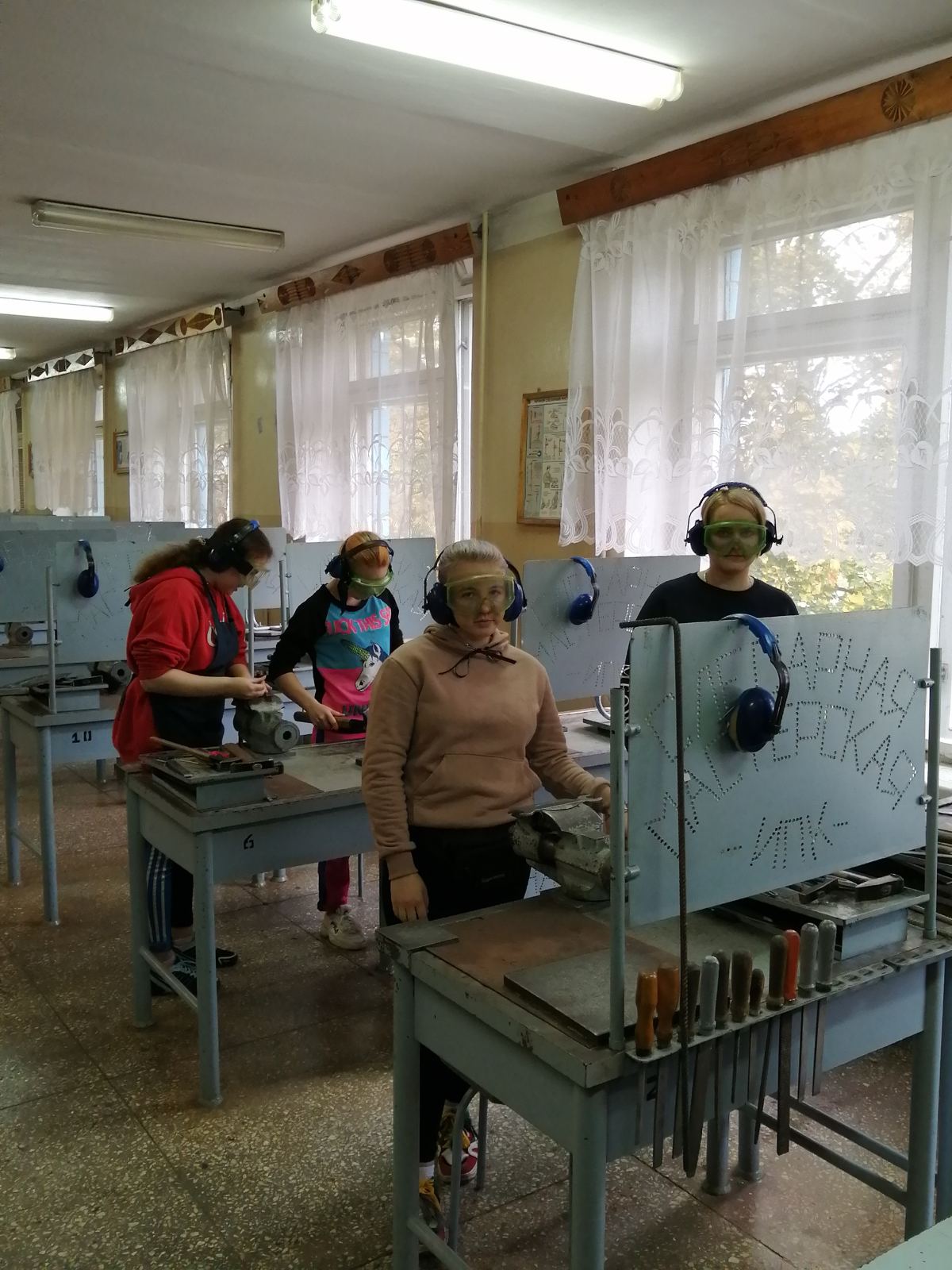 Учебная группа 131-219 проходит слесарную практику в учебной мастерской колледжа. Учащиеся получают навыки ручной и механической обработки металла.